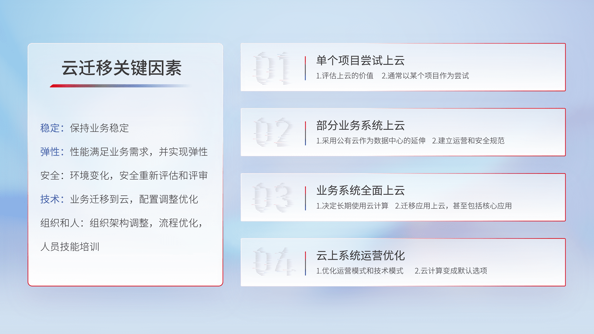 结合实际业务,,,从规划设计、、、云平台选型、、、、云原生改造、、、数据迁移、、、集成交付,,,迁移全过程为客户识别最佳上云路径,,,,做好风险识别管理,,,设计网络架构、、身份权限、、、安全审计合规、、操作审计、、日志审计、、监控告警策略、、、、多站点容灾设计等,,对云上基础设施进行整体规划,,,提升IT治理水平,,以满足弹性、、、高可用、、、、高性能的需求。。