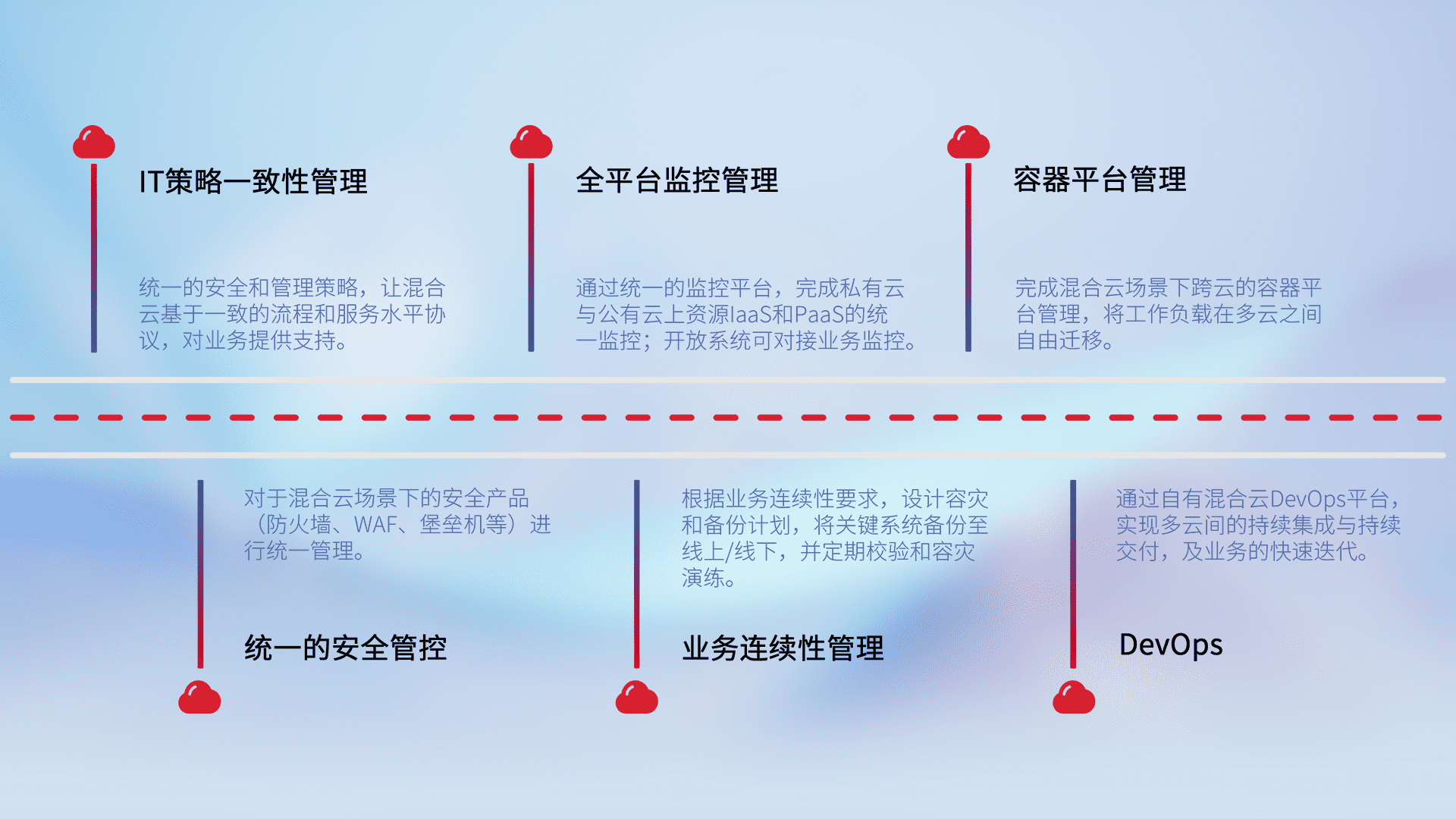 通过多云纳管,,,,以统一的资源数据模型把客户的云资源进行抽象和封装,,,,进而实现对多云资源的统一操作,,,保障云资源管理的可靠性、、、稳定性与可用性。。。量身定制化运维内容,,配置、、开发运维、、、、补丁管理、、、、备份、、监控、、、认证和访问管理、、、、审计和日常巡检等,,,,保障在用云过程中的可靠度,,,,稳定度以及高可用率。。。