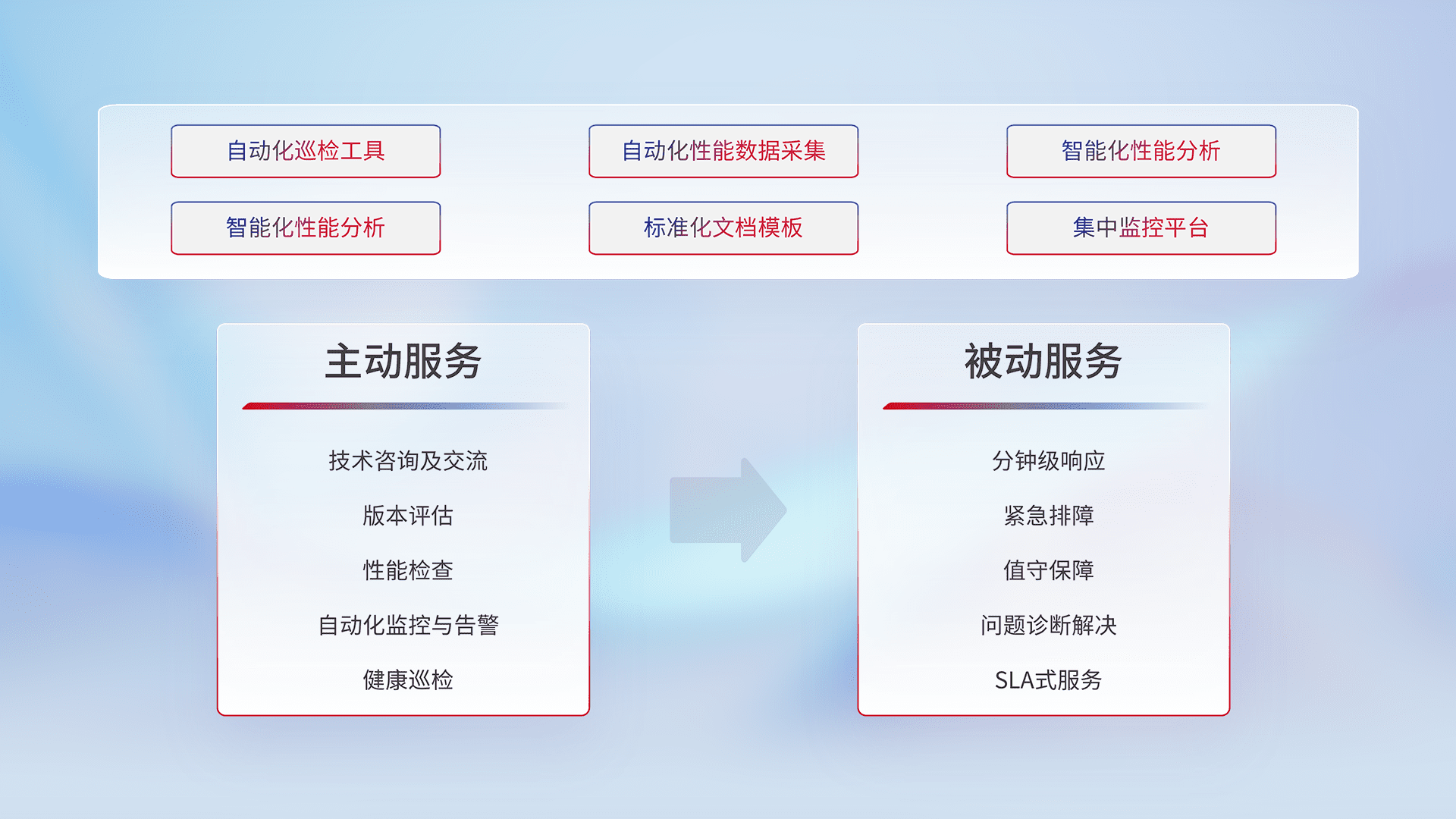 智能化工具和标准化文档,,,,保障服务质量,,提供主动服务(包含技术咨询、、、、版本评估、、、、性能检查、、、自动化监控与告警、、、、健康巡检)和被动服务包含(分钟级响应、、紧急排障、、、、值守保障、、问题诊断解决、、SLA服务)。。。。