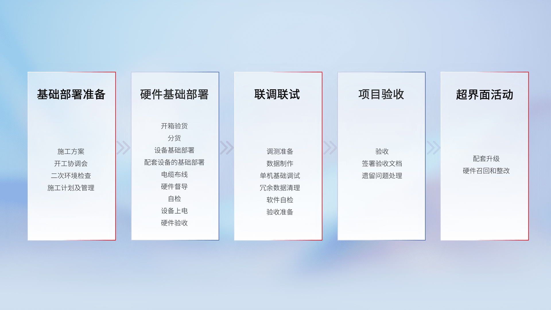 从基础部署准备、、硬件基础部署、、、联调联试、、项目验收、、、、越界面活动的全过程可追溯,,保证施工质量和进度。。。